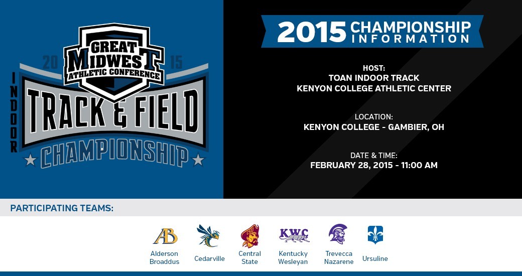 2015 Men's and Women's Indoor Track and Field Championships QUICK LINKS: | NCAA DII Championships (M) / (W) | Men's Indoor Track & Field Archives | Women's Indoor Track & Field Archives WOMEN'S INDOOR T&F LINKS: Schedule/Results Performance List Athletes of the Week All-Conference Awards MEN'S INDOOR T&F LINKS: Schedule/Results Performance List Athletes of the Week All-Conference Awards EVENT INFORMATION MEN'S TEAM CHAMPION Cedarville University Total Points: 183 Recap EVENT SCHEDULE 11:00 AM - FIELD EVENTS 12:00 PM - TRACK EVENTS HEAT SHEETS | FINAL RESULTS WOMEN'S TEAM CHAMPION Ursuline College Time: 211.50 Recap FACILITY INFORMATION TICKET INFORMATION Admission - $10 adults; $5 students with ID (kids 6 and under are free) INDOOR FACILITY INFORMATION Toan Indoor Track - Kenyon College Directions to Kenyon College HOST INFORMATION Kenyon College Athletic Website Kenyon College Website Gambier, Ohio Website Gambier, Ohio Weather